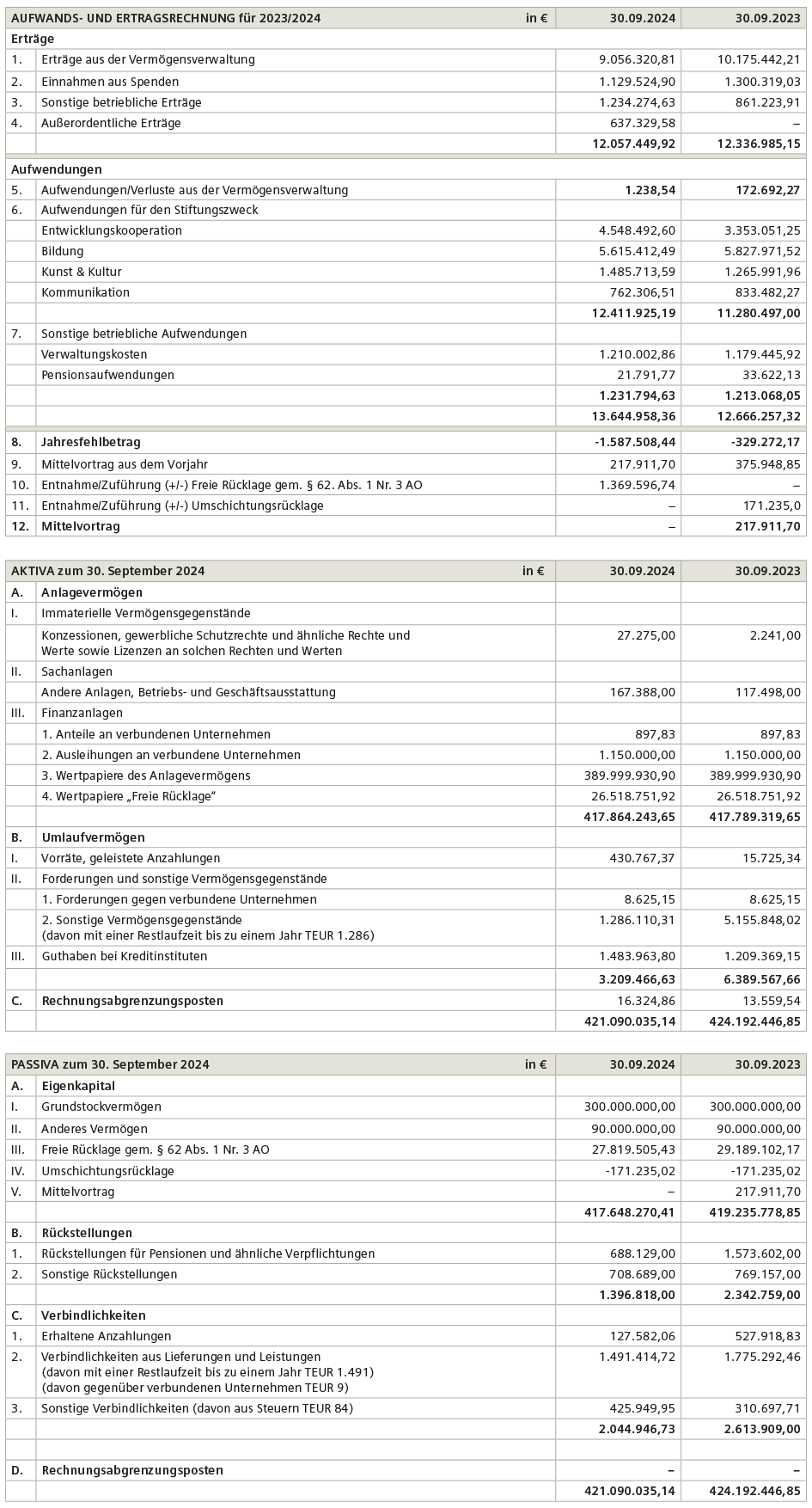 Die Kanzlei Wallenhorst, München, hat die Prüfung des Jahresabschlusses und des Lageberichts der Siemens Stiftung zum 30. September 2024 nach den Grundsätzen des HGB und Artikel 16 BayStG unter Beachtung der vom Institut der Wirtschaftsprüfer (IDW) festgestellten deutschen Grundsätze ordnungsmäßiger Abschlussprüfung vorgenommen und mit dem uneingeschränkten Bestätigungsvermerk versehen.
